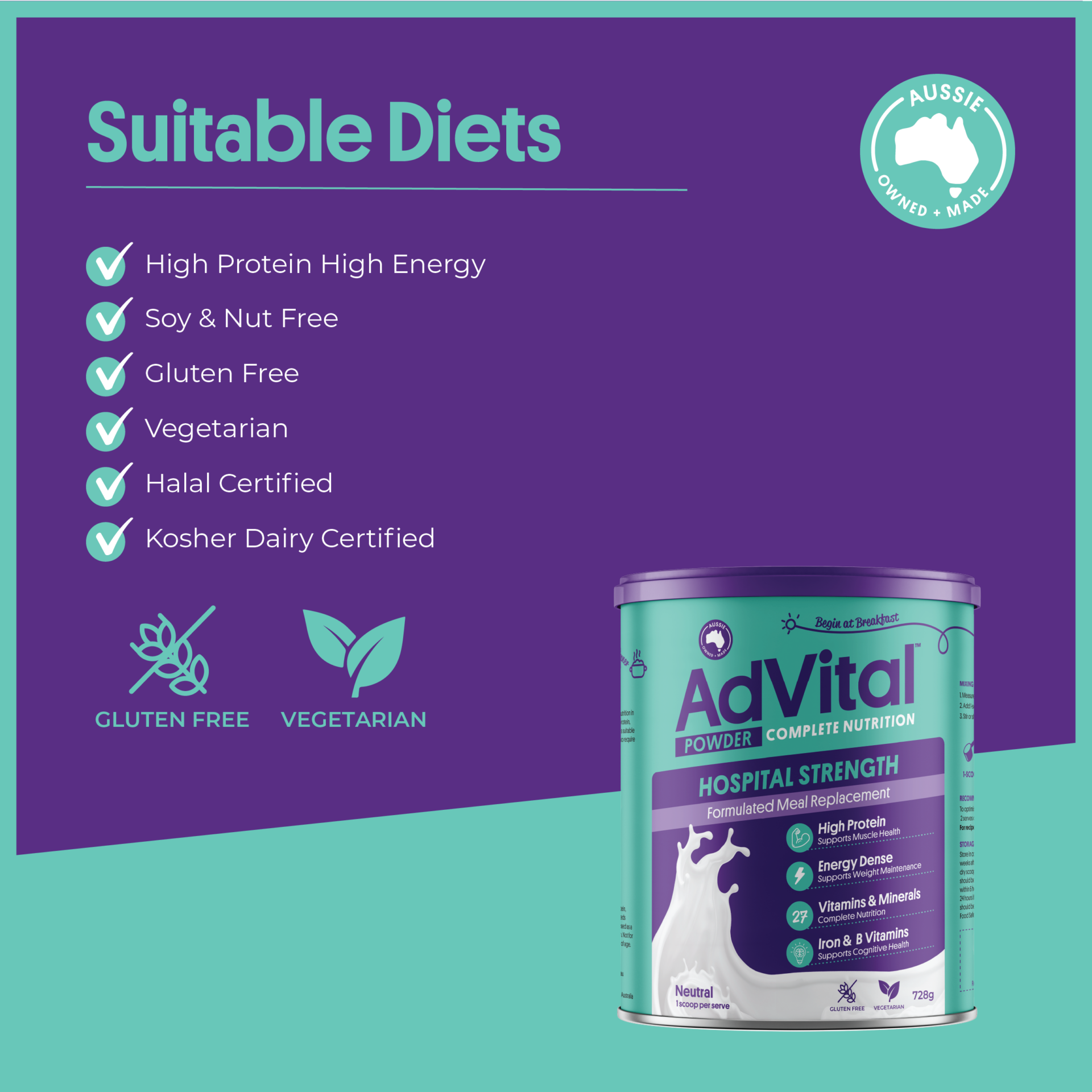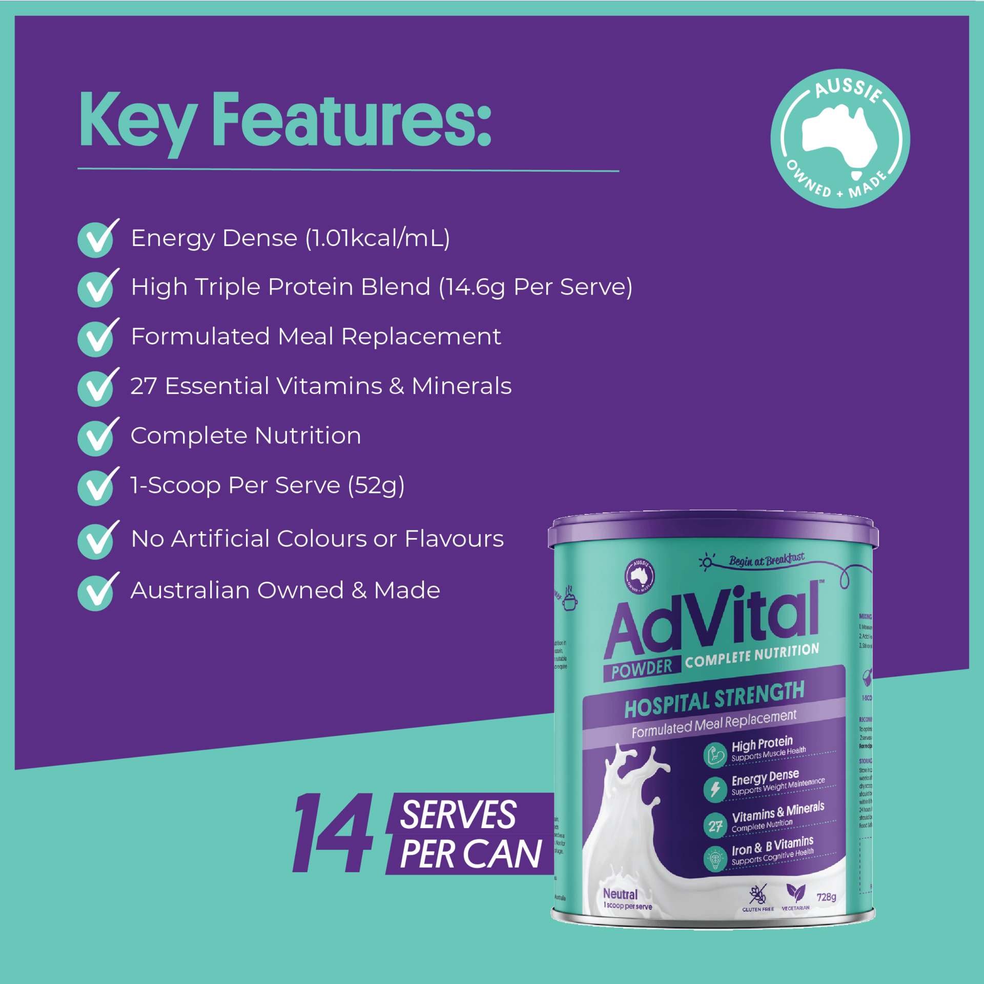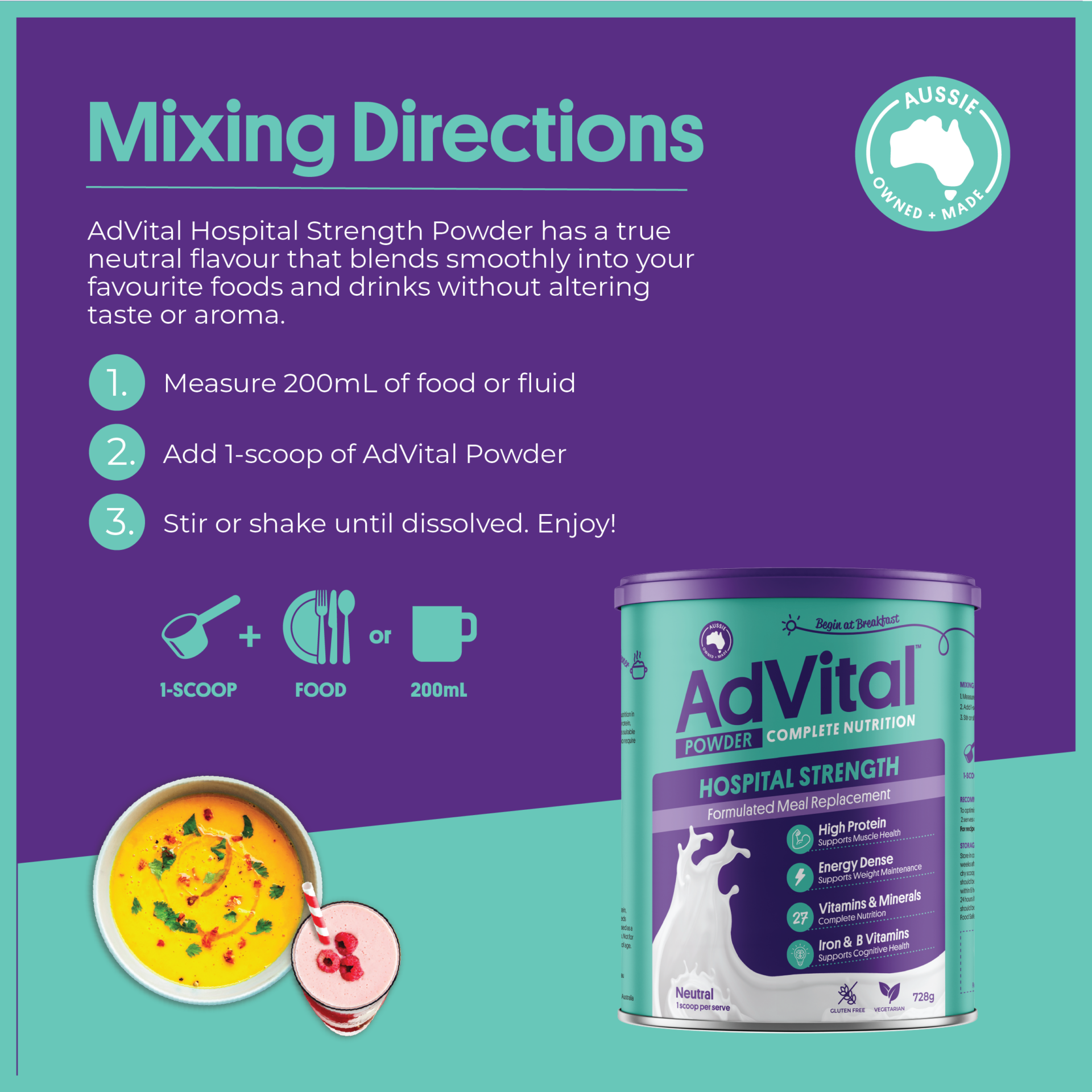 Proudly Australian-owned and made, AdVital Hospital Strength Neutral Powder can be easily mixed into your favourite meals, snacks, or drinks!